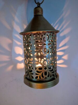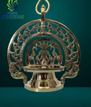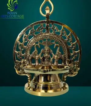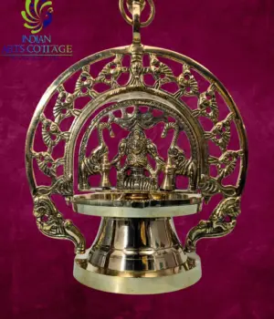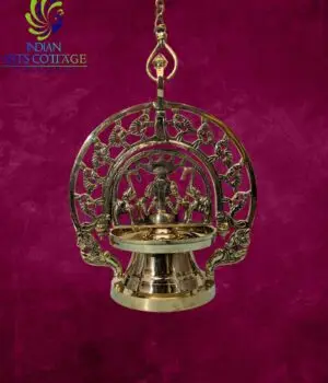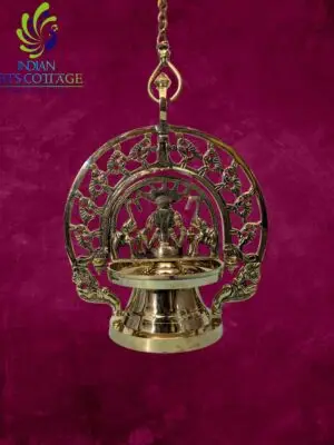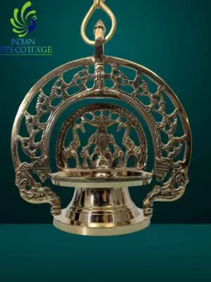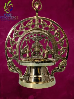 Material : Brass Color: Brass Gold Glossy Polished Lamp Height:12 Inch Width:10 inch Diameter of Lamp:6 Inch Total Height with Hanging chain:35 InchGaja Lakshmi Hanging Vilakku(Lamp) 9 In