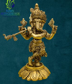 Material : Brass Color: Brass Gold Glossy Polished Lamp Height:9 Inch Width:8 inch Diameter of Lamp:5 Inch Total Height with Hanging chain:32 InchGanesha Idol with Flute Brass 7 In